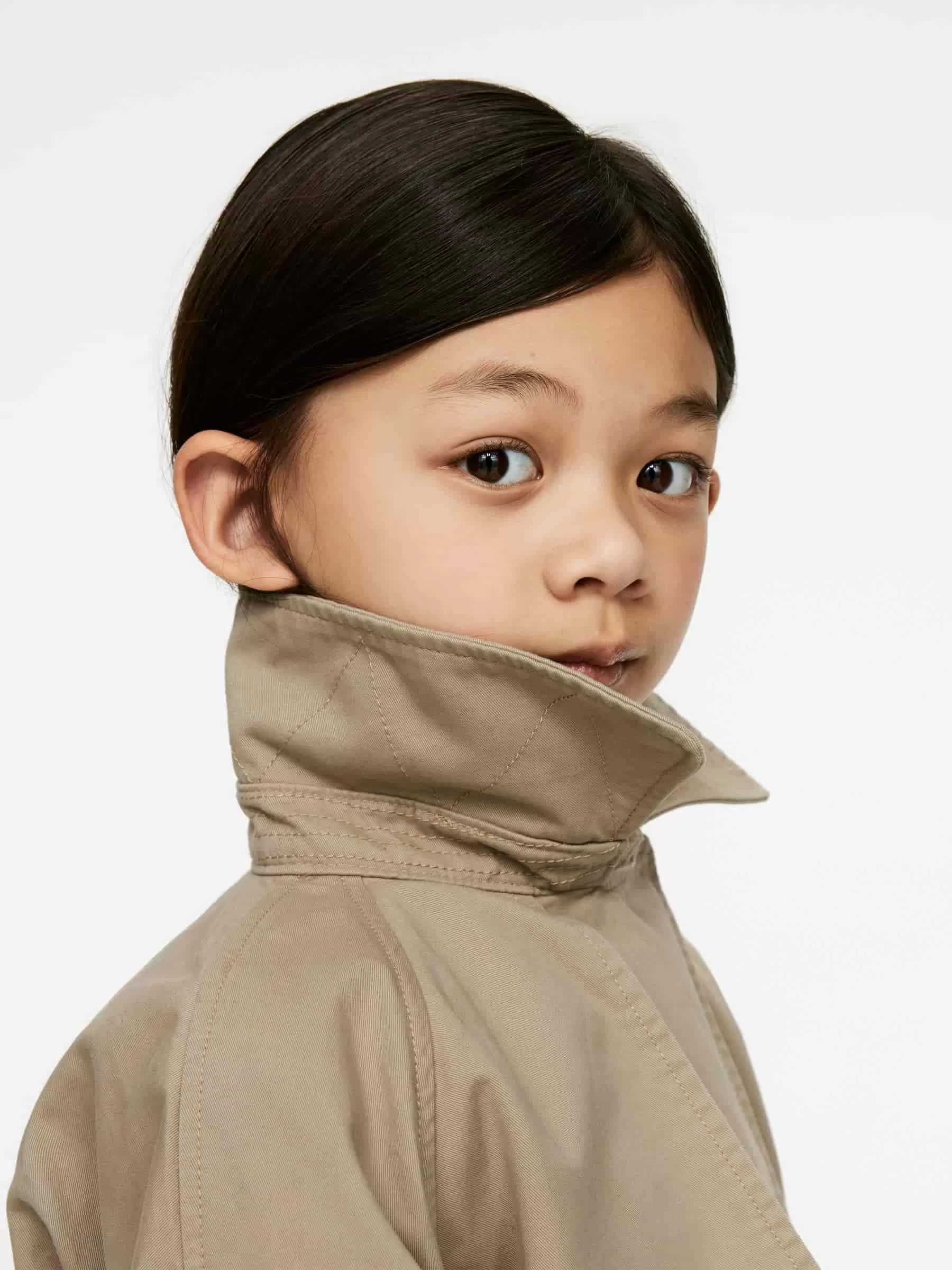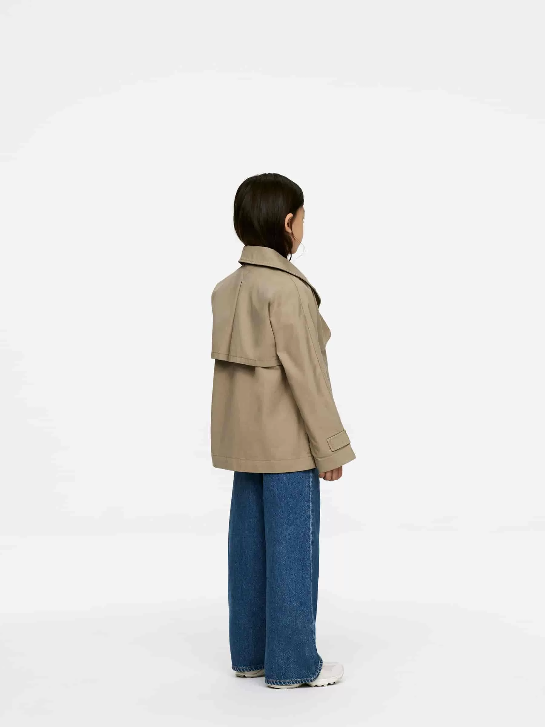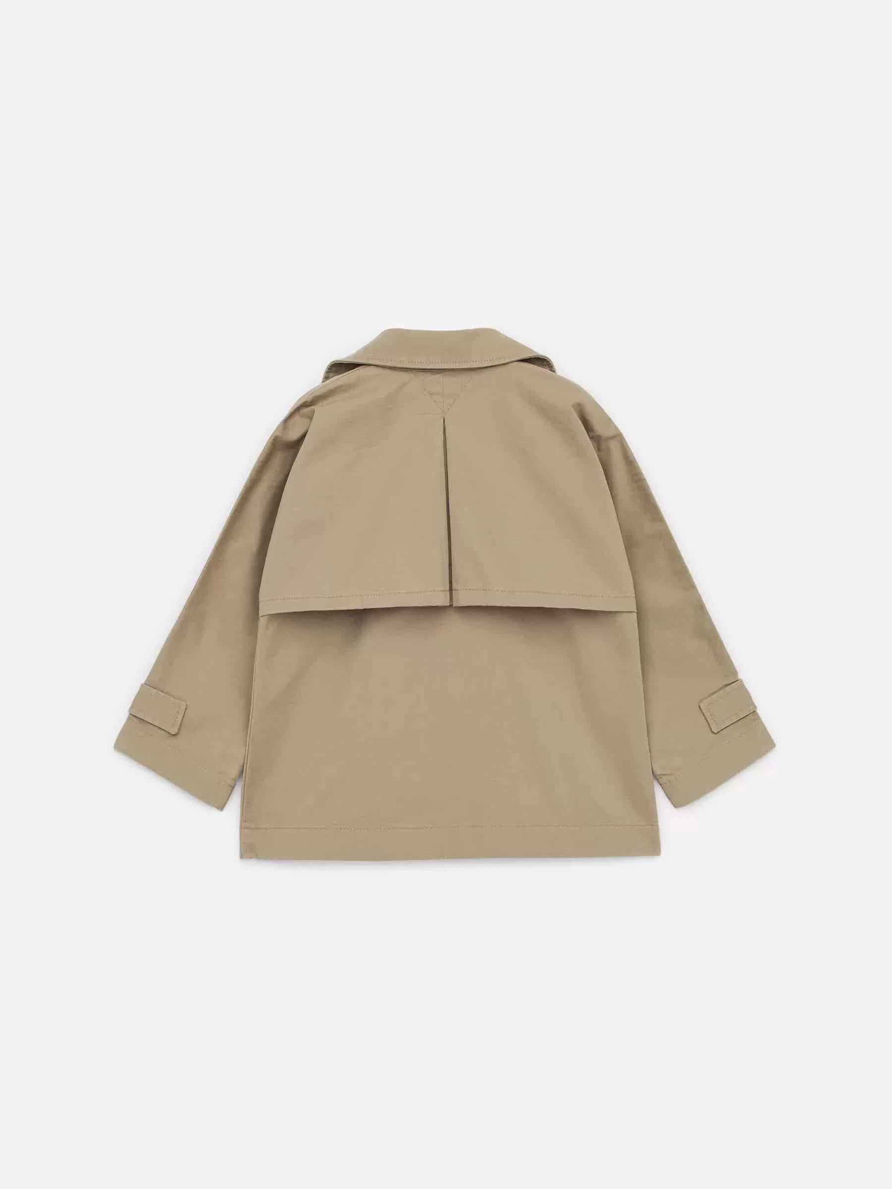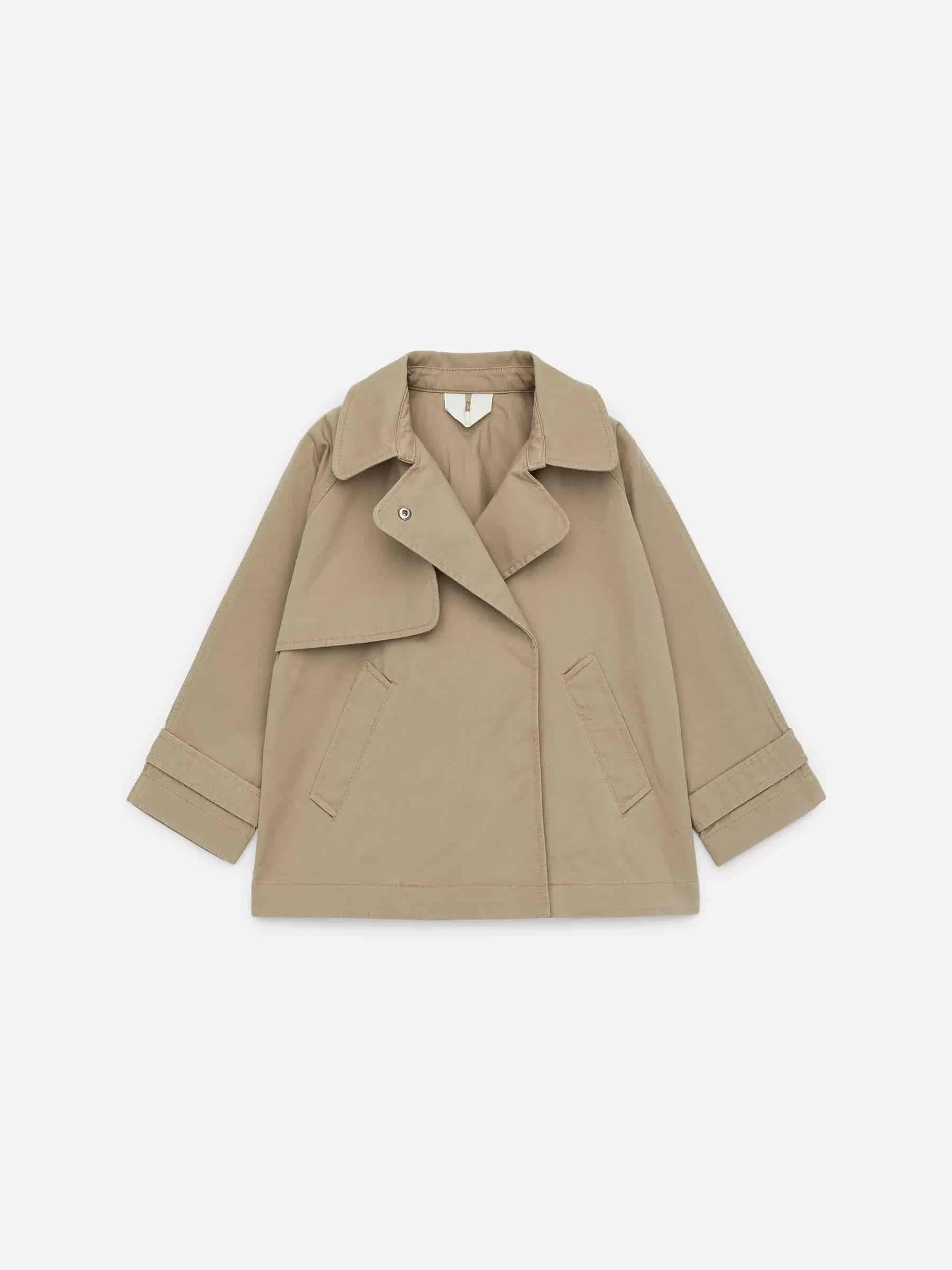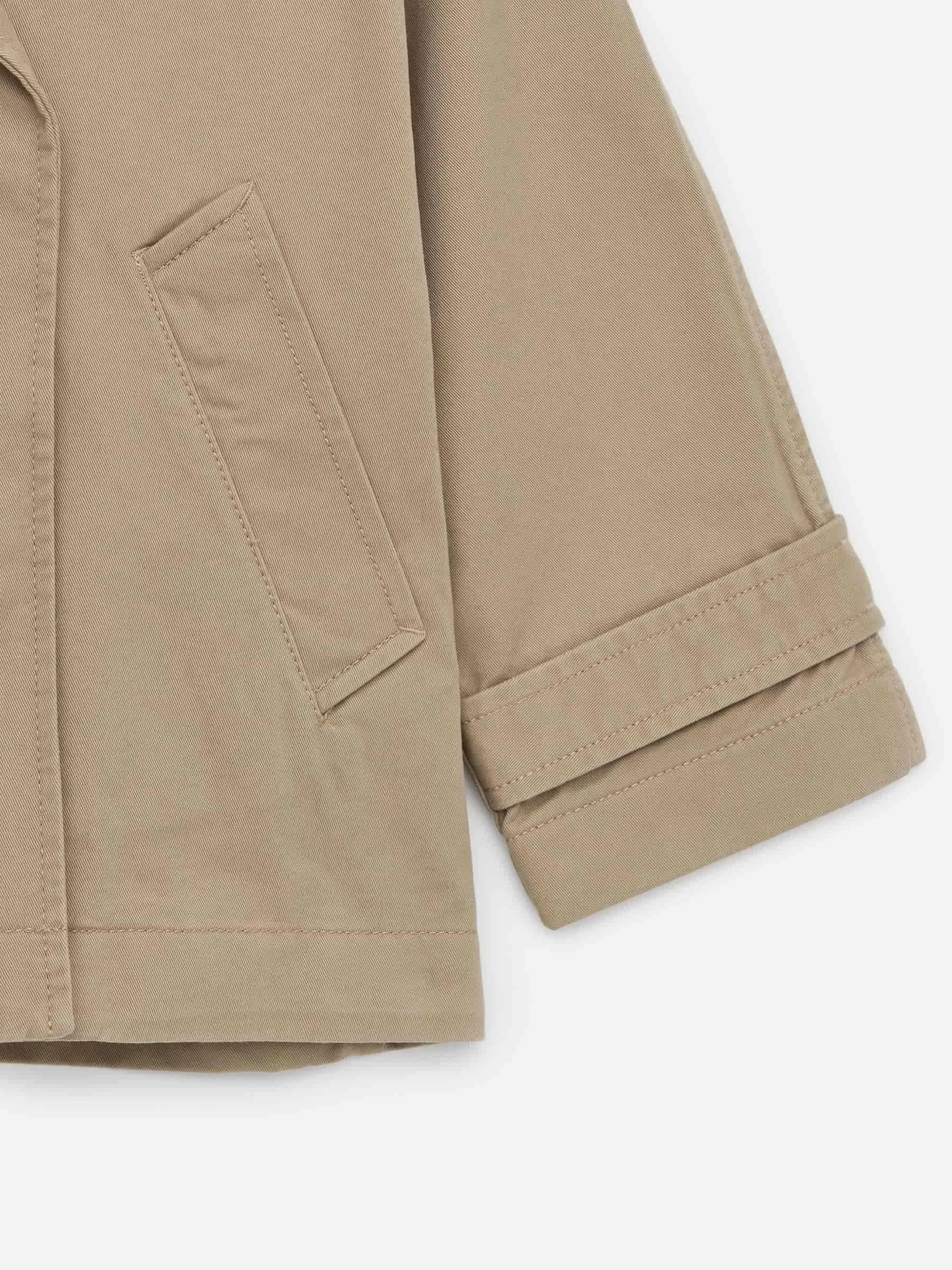 Kurzer Trenchcoat aus Baumwolle. Ausgestattet mit schrägen Seitentaschen, versteckten Druckknöpfen vorne und Manschettenriemen.